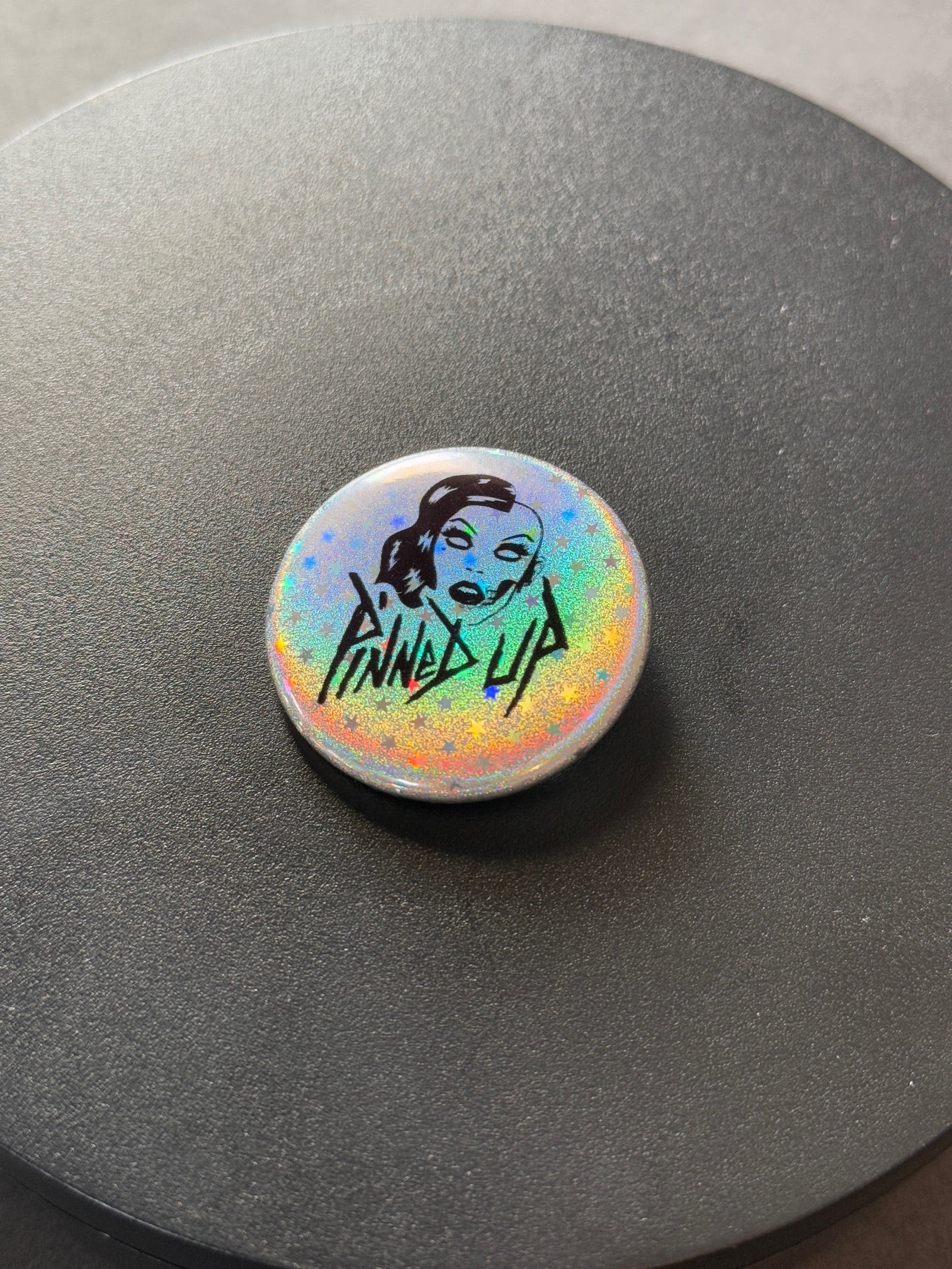 These one-of-a-kind custom made pinback buttons feature a shiny holographic background with stars that reflect bright colors and create an eye catching effect. This option goes best with designs or logos without a full background, allowing the holographic background to shine behind your design.