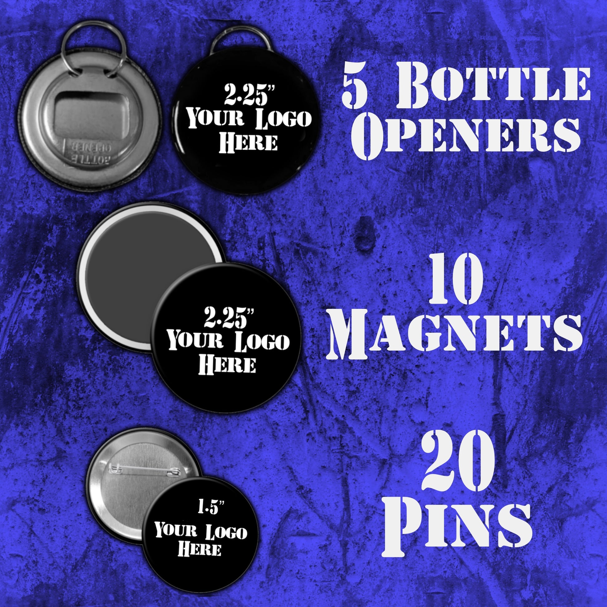 Bundle includes a mix of 2.25" Magnets and Bottle openers with regular pinbacks.